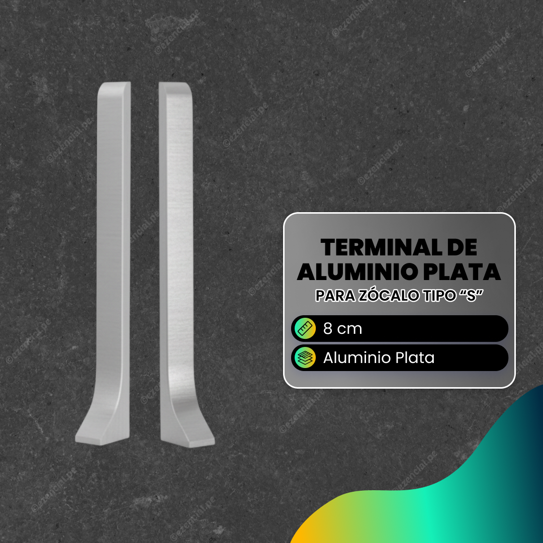 Completa tus acabados con el terminal y/o inicio para zócalo de aluminio plata "tipo s", diseñado para brindar un cierre limpio, estético y duradero en los extremos de tus zócalos. Compatible con perfiles de 8 cm de altura, este terminal asegura un acabado profesional y evita filtraciones de polvo o humedad. Hecho de aluminio de alta calidad, combina elegancia con resistencia, ideal para espacios residenciales o comerciales que buscan un detalle moderno y sofisticado.